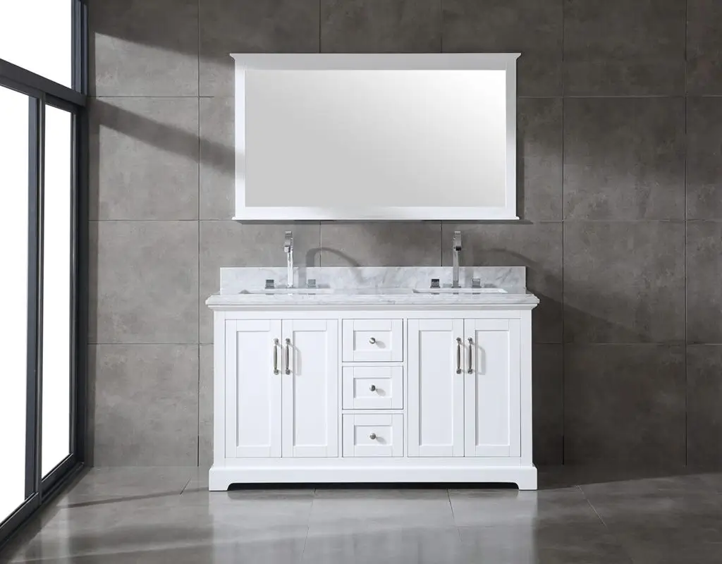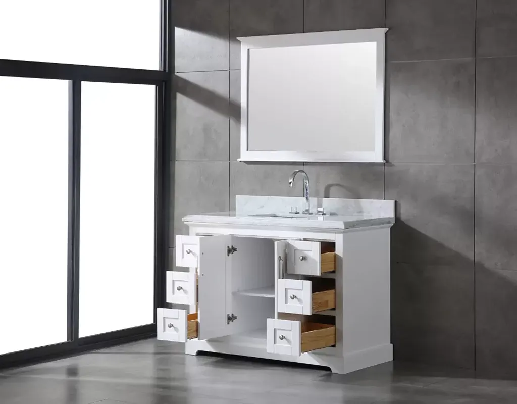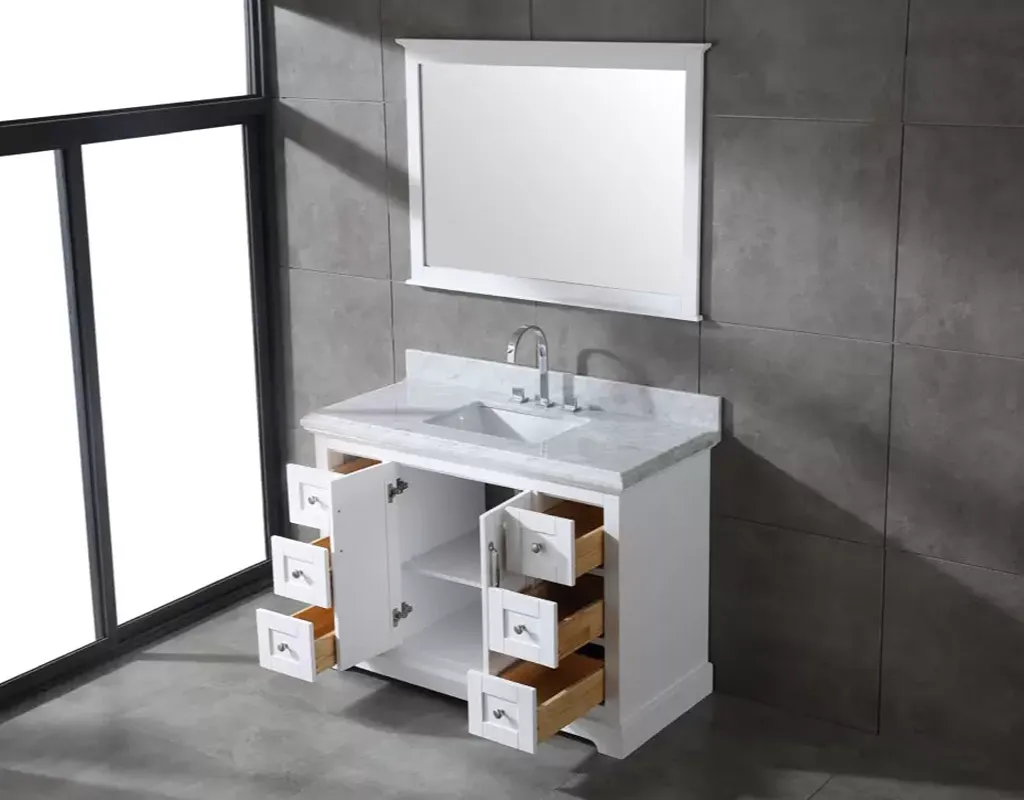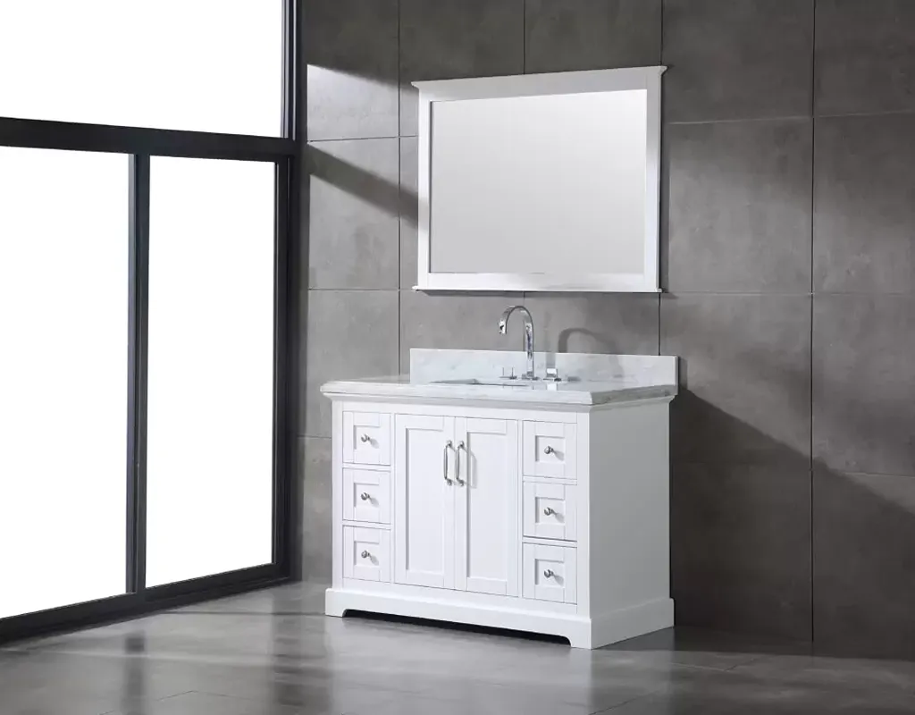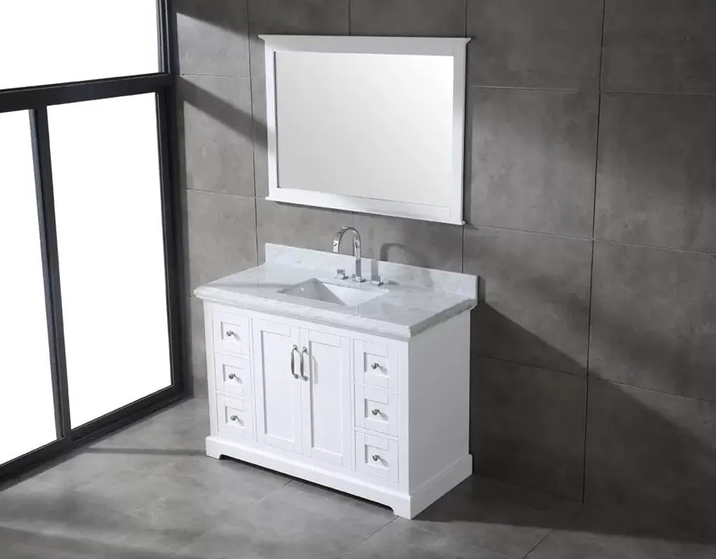 - OVERALL DIMENSIONS & PACKAGE INCLUDED: Overall bathroom vanity with single sink dimensions are 48″L x 22″W x 35″H. Matching mirror’s dimensions are 44″L x 32″H. Package includes freestanding white 48 inch bathroom vanity main cabinet, marble countertop with undermount ceramic sink & backsplash and matching wood mirror. (Attention) Faucets are NOT included.