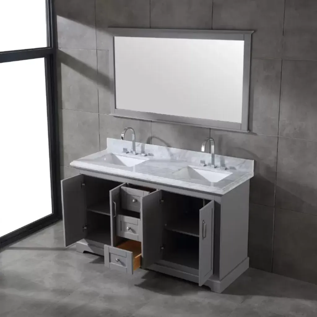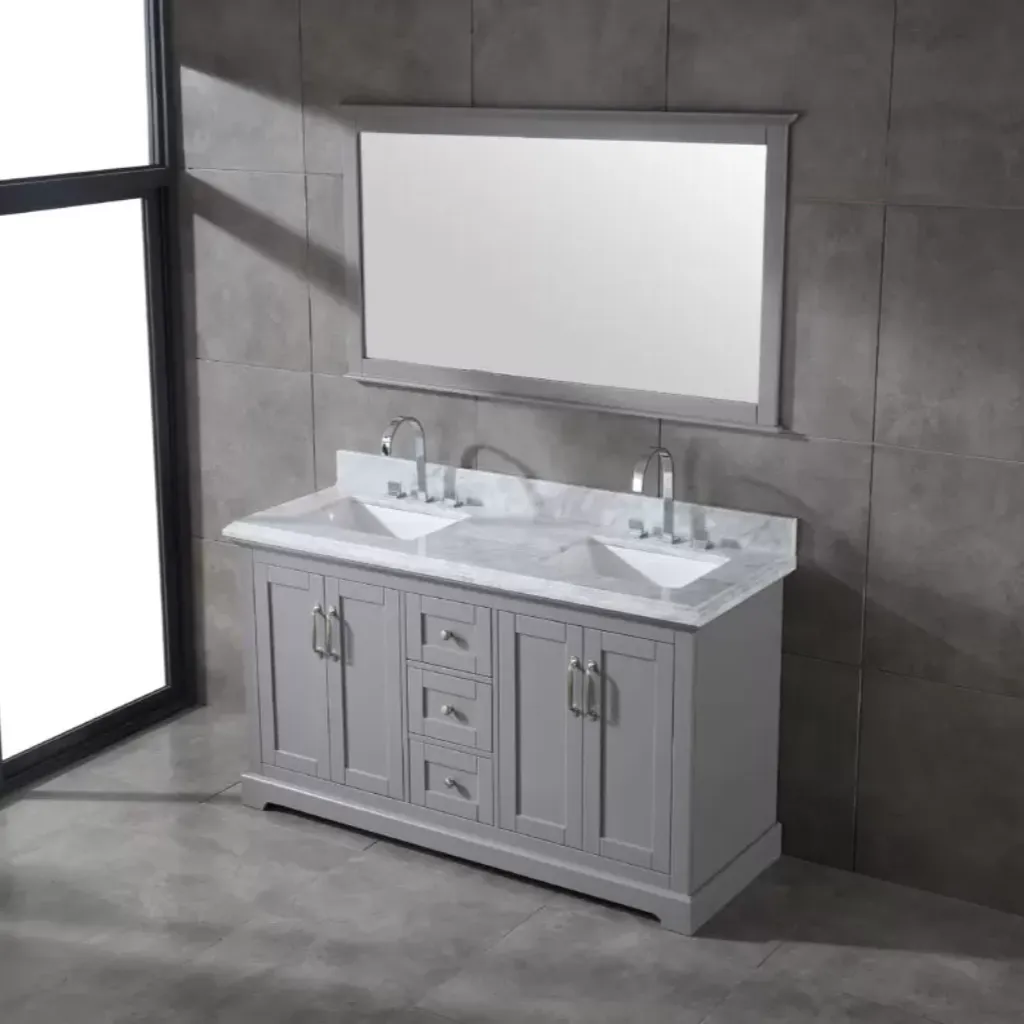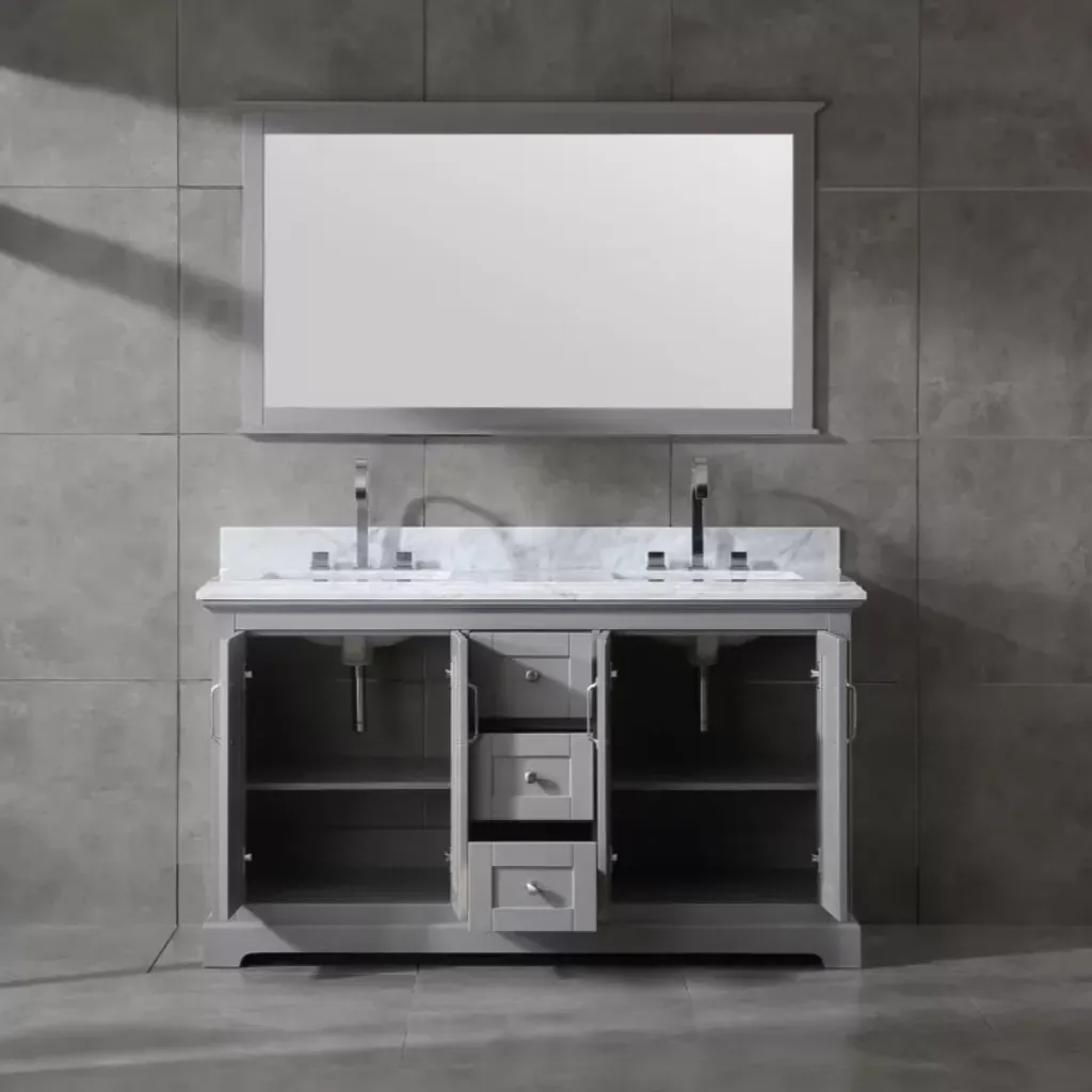 - OVERALL DIMENSIONS & PACKAGE INCLUDED: Overall bathroom vanity with double sink dimensions are 60″L x 22″W x 35″H. Matching mirror’s dimensions are 56″L x 32″H. Package includes freestanding gray 60 inch bathroom vanity main cabinet, marble countertop with undermount dual ceramic sink & backsplash and matching wood mirror. (Attention) Faucets are NOT included.