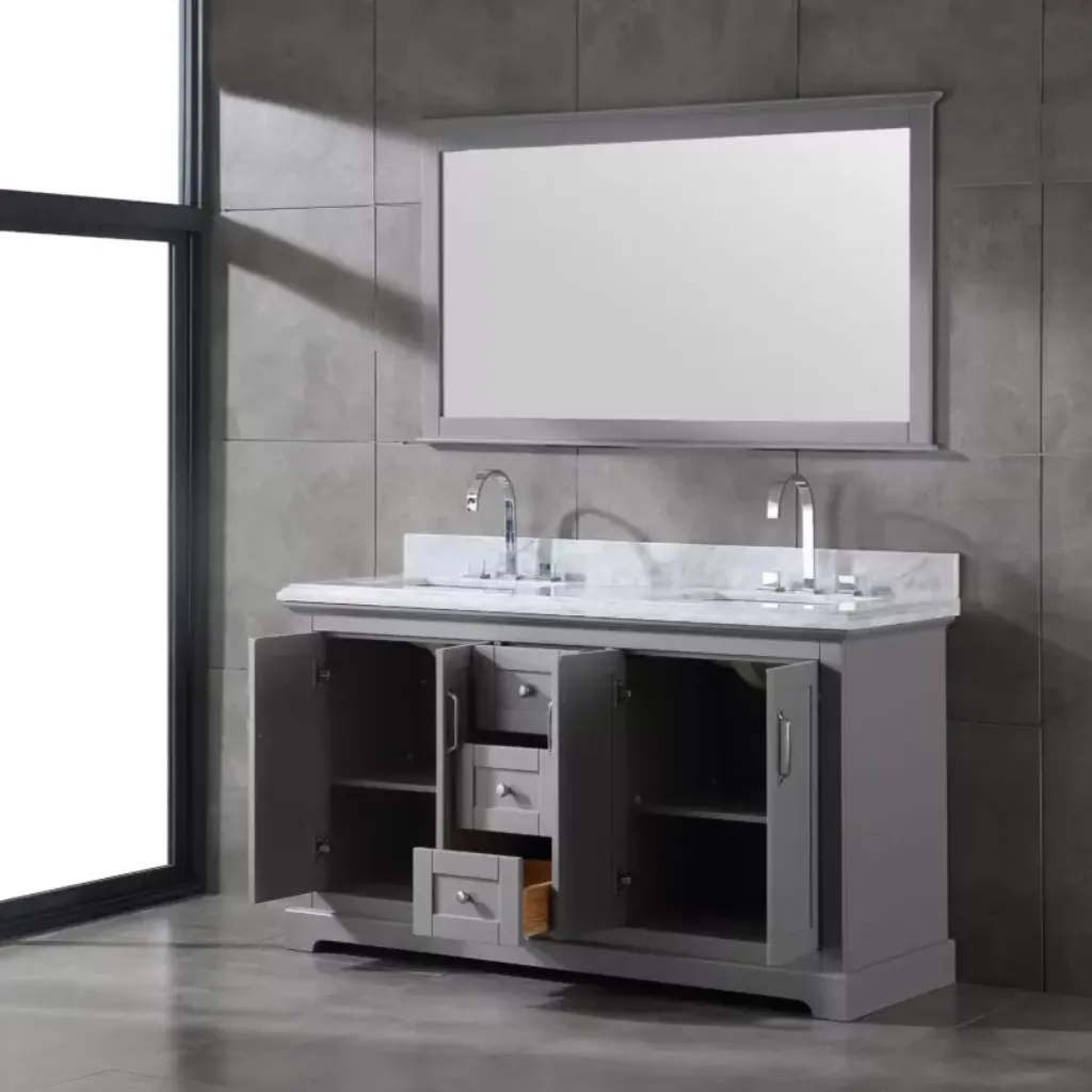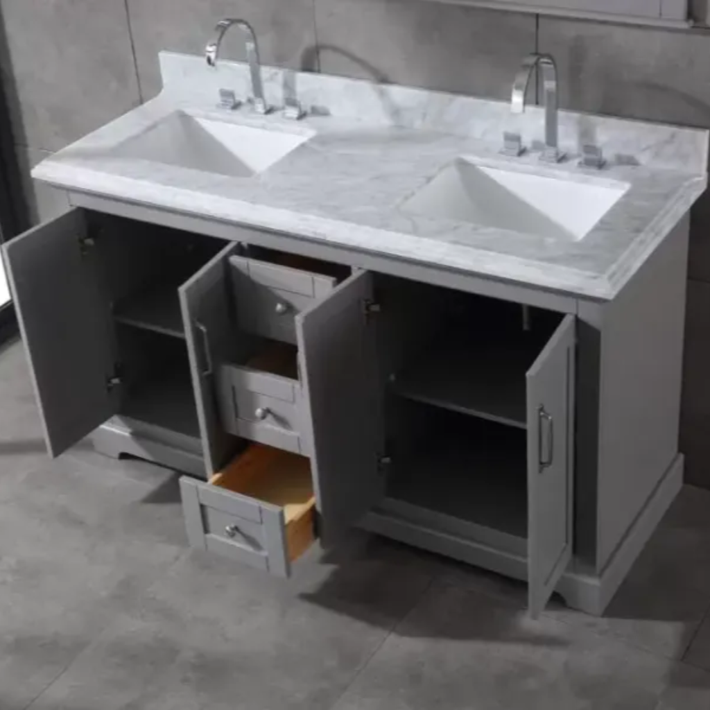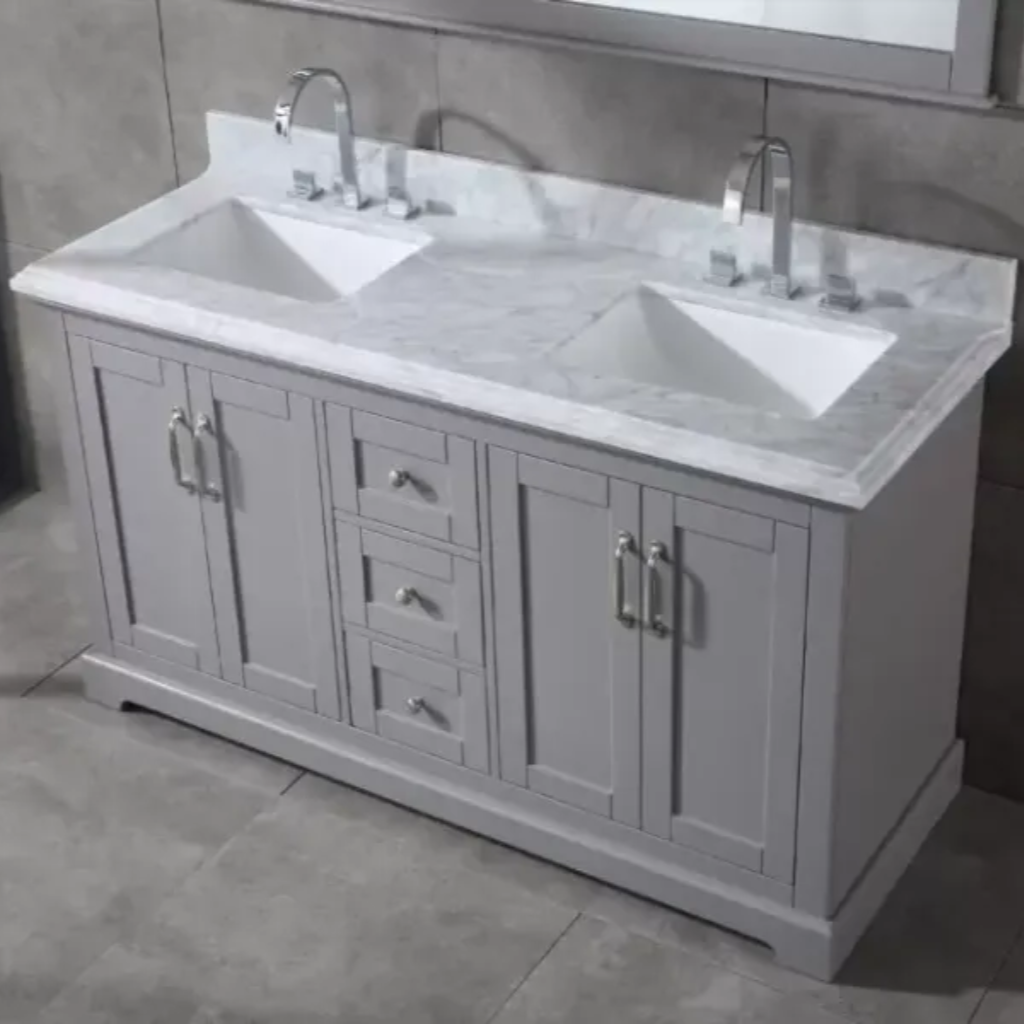- OVERALL DIMENSIONS & PACKAGE INCLUDED: Overall bathroom vanity with double sink dimensions are 60″L x 22″W x 35″H. Matching mirror’s dimensions are 56″L x 32″H. Package includes freestanding gray 60 inch bathroom vanity main cabinet, marble countertop with undermount dual ceramic sink & backsplash and matching wood mirror. (Attention) Faucets are NOT included.