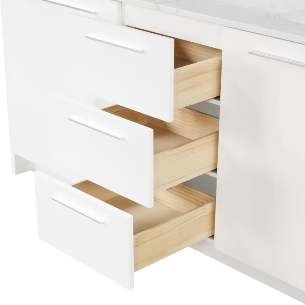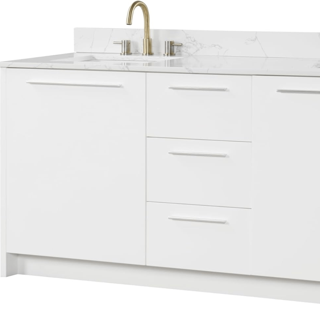 The deep drawers offer plenty of space for storing towels, linens, and other bathroom essentials, while the cabinets are perfect for larger items such as cleaning supplies or extra toiletries. The vanity’s storage solutions are designed to maximize space while maintaining a clean and elegant appearance, ensuring that your bathroom always looks tidy and well-organized.