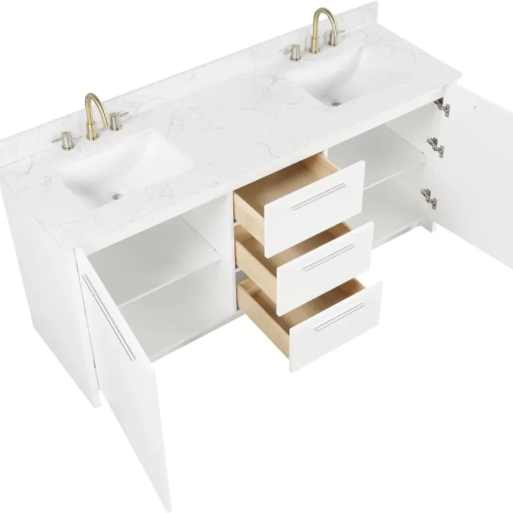 Each sink is set into a spacious countertop that provides plenty of room for toiletries, cosmetics, and other bathroom essentials. The countertop is crafted from high-quality materials that are resistant to stains, scratches, and moisture, ensuring that it remains beautiful and functional over time. The ample counter space combined with the double sinks makes this vanity both practical and luxurious, enhancing your daily routine.